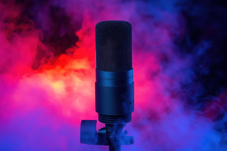 Professional studio microphone set against colorful lights and mist, symbolizing audio production, broadcasting, or music recording.