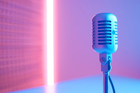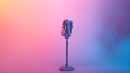 Classic microphone glowing in vibrant pink and blue lighting, creating a dramatic backdrop for musical performances, stand up comedy, or open mic events