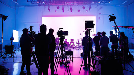 Silhouette of person gesturing in front of bright stage lights, surrounded by cameras and crew members. atmosphere is dramatic and cinematic, capturing essence of filmmaking and creativity