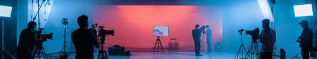 Behind-the-scenes silhouette of a video production team, with a director, cameraman, and lightman coordinating in a studio for a commercial shoot