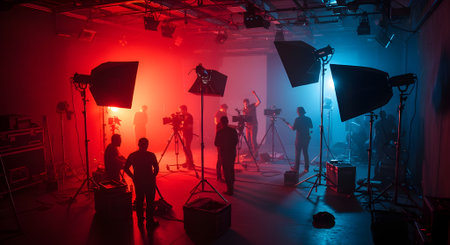A cinematic production studio equipped with advanced lighting and camera setups, showcasing a professional environment ideal for innovative film and video projects.