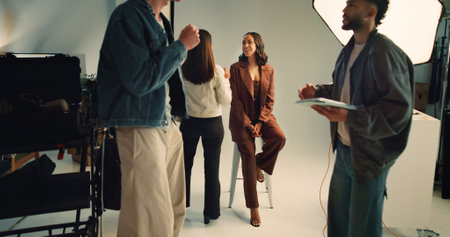 Studio for photo video production with lighting equipment and cyclorama, team members preparing lights and camera, model sits on director chair talks with assistant.