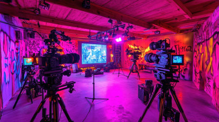 A vibrant filming studio showcasing various professional cameras poised for creative video production. Colorful graffiti adds an artistic touch to the modern setting.