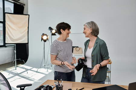 A middle-aged lesbian couple stands confidently side by side in a modern photo studio.