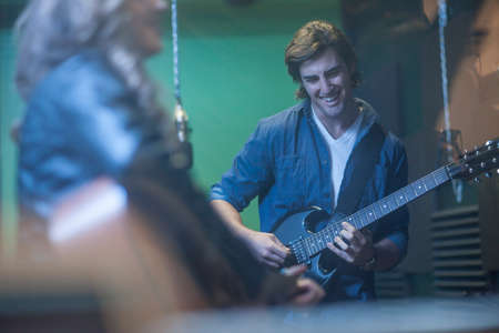 Two musicians in recording studio, playing guitar