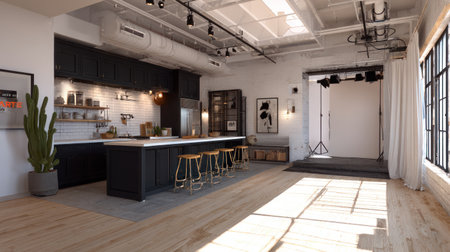 A modern loft interior featuring a kitchen and a setup.
