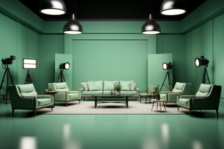 Shooting studio with professional equipment, green walls and floor. Spacious room for an interview or talk show with furniture and floor lamps. Professional studio lighting, powerful spotlights