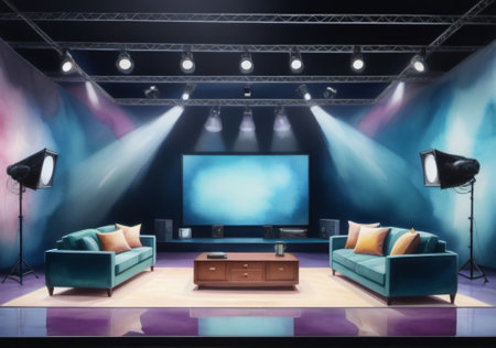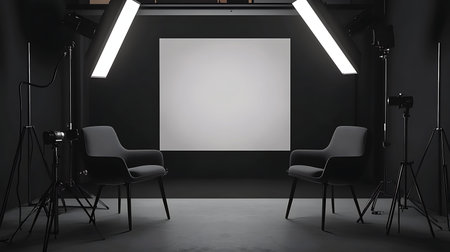 Studio for interview and podcast. Two empty chairs and spotlights in dark room. Created with Generative AI