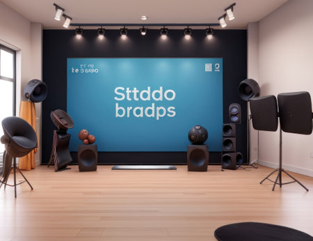 Studio equipment in studio room with empty space, 3D rendering