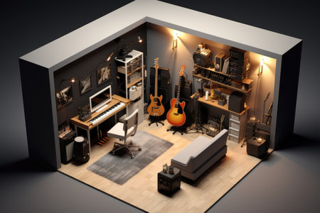 A compact, small space recording studio concept for urban living, Interior of recording studio home, music studio, AI generated