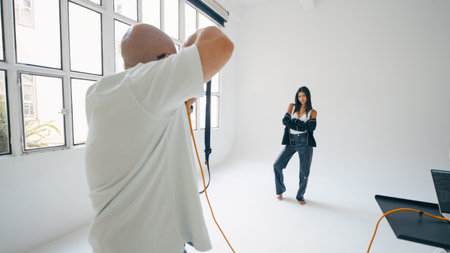 Backside view of photographer taking photo of beautiful multiracial model in studio. She posing in front of white background.
