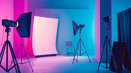 A modern photo studio setup with colorful pink and blue lighting, showing a backdrop and lighting equipment, ideal for portraits and commercial photography.