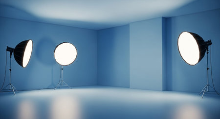 A photography studio setup with lighting equipment and a soft, diffused glow.