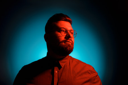 Serious man in eyeglasses looking at camera in neon light