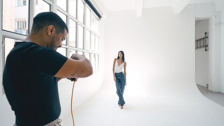 Backside view of photographer taking photo of beautiful multiracial model in studio. She posing in front of white background.