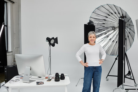 A mature woman, dressed in a white shirt and blue jeans, stands confidently in a photo studio.