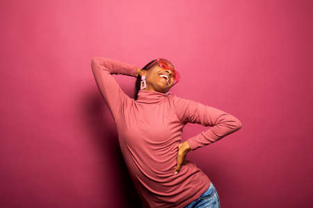 Pretty young african american girl enjoys dancing with her eyes closed, touches her hair, holds her hands to her head, opened mouth as singing, has fun,wearing red singlet, isolated on pink background