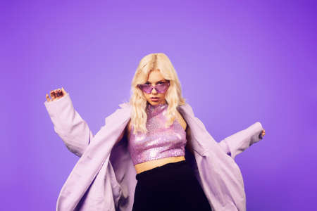Girl in a purple jacket on a purple background in 70s, 80s, 90s style makeup, long silver earrings and purple sunglasses and a pink jacket. Woman dancing, party, music.