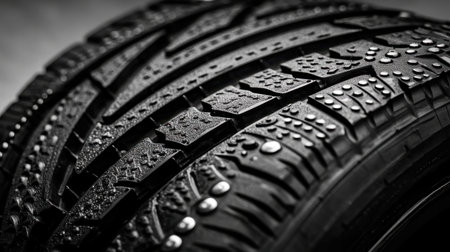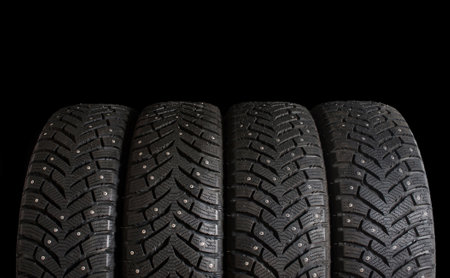 Winter tires with spikes on a black background close-up, safety during winter driving, winter tire protector, winter studded rubbe