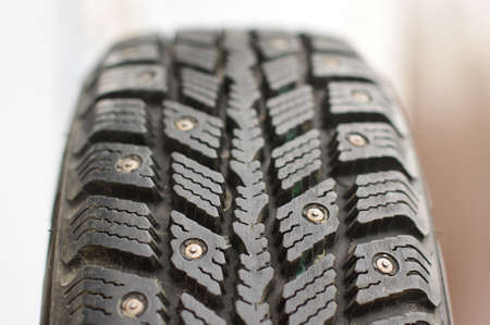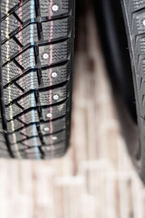 Close-up of winter rubber wheels for a car with spikes, selective focus