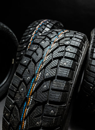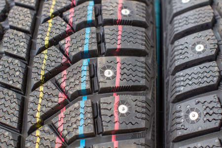 New, black winter car tires with spikes. Safe driving, preparing for winter. Tires with yellow, blue and red stripes