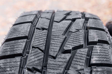 Close-up view of the winter tread of a new tire in shop. Automobile tire for snow road. Selective focus. Sale tires in shop. Safety concept.