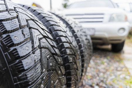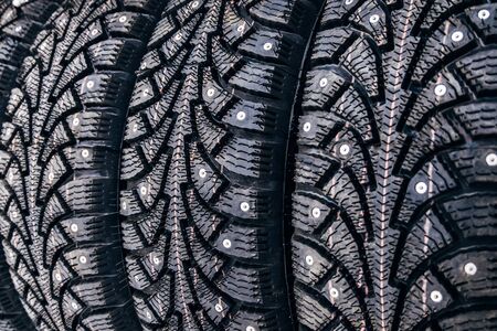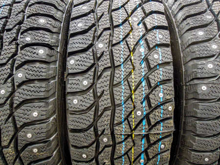 Clean new modern studded winter tires in row. Tires with spikes, close up.
