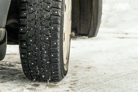 Car wheel with winter studded tread on snowy road. Close-up detail.