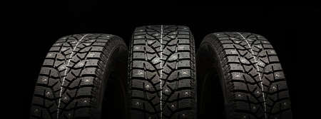 three studded winter tires wheels in a row on a black background, panoramic shot.