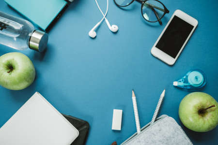 Modern Work space for healthy person: pencils, water, apple, phone, glasses, headphones on a blue background. Top view, flat lay