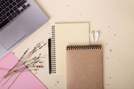 headphones, pen, notebooks and branches of lavender are beautifully laid out near the laptop. The concept of working from home. Beautiful layout. High quality photo