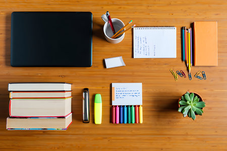 Top view of a desk with a lot of stationery and books