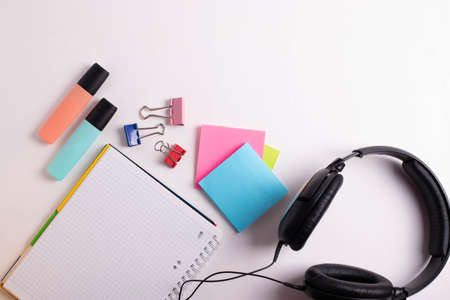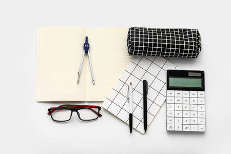 different stationary supplies items on white office or studying desk