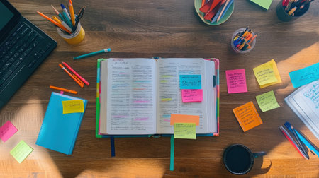 Vibrant desk space with colorful index tabs, sticky notes, and open textbooks surrounded by writing tools