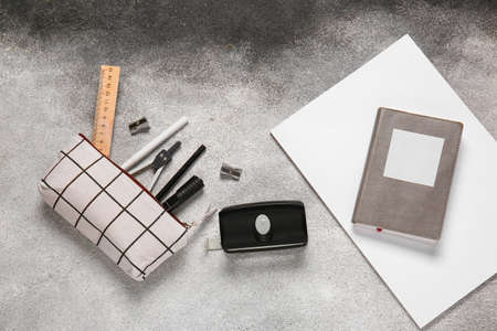 Stylish pencil case with stationery on black and white background