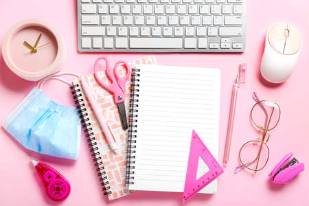 Set of stationery, computer keyboard and medical mask on color background