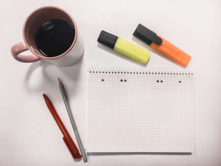 A high angle shot of a cup of coffee with two highlighters and pens near a notebook on a white background