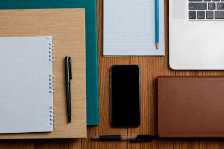 Books, phone, laptop and office supplies on wooden desktop