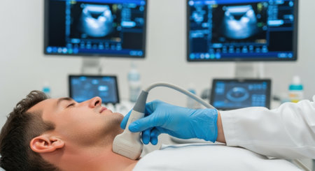 A male patient undergoes an ultrasound examination of his neck, performed by a doctor using a transducer. Medical monitors display the diagnostic images in a clinic setting.