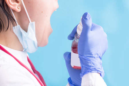 Spray for sore throat. Photo of woman doctor who treats her throat with a spray. The concept of health