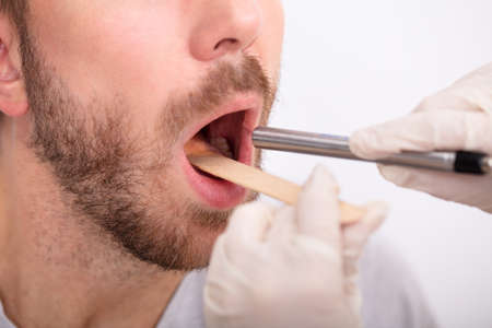 Close-up Of Doctor's Hand Examining Man's Throat With Tongue Depressor