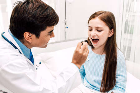 Doctor checking and examination in mouth with little girl child throat in hospital.healthcare and medicine