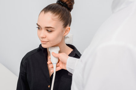 Doctor in diagnostic center making ultrasound thyroid gland test. Ultrasound of thyroid gland