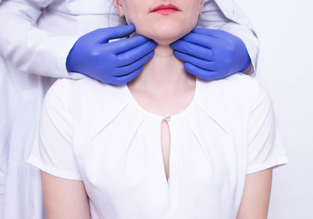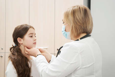 Doctor specialist diagnoses palpation on the throat of the caucasian girl for the presence of enlarged lymph nodes and tumors, adenoids, discomfort