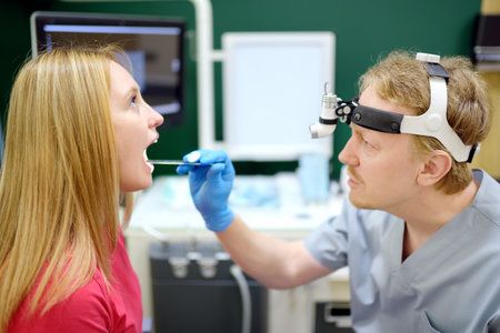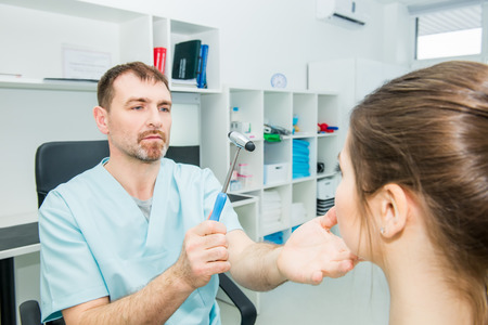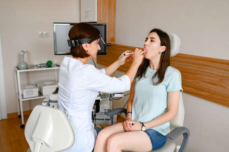 Consultation of woman with otolaryngologist in a medical clinic. Visiting ENT doctor for examination of the state of health of the ear, throat and nose