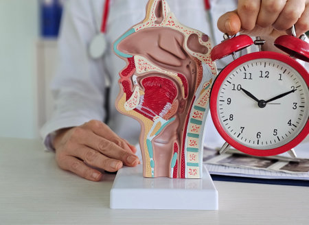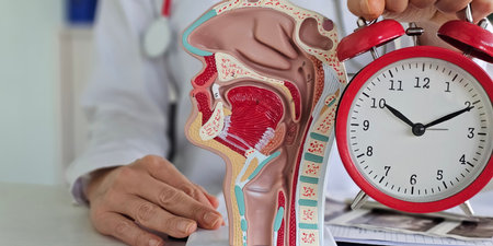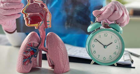 Healthcare professional examines a model of the human respiratory system while holding a clock, indicating the importance of timely diagnosis during patient consultations.