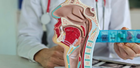 Doctor showing model of nasal cavity and throat anatomy on blue background.
