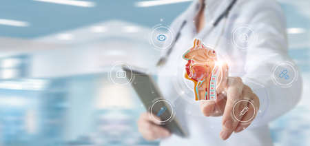 Doctor clicks on a virtual computer screen on the anatomy of the mucous membranes of the throat and nose.