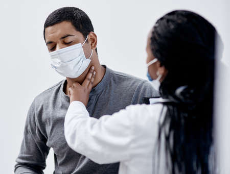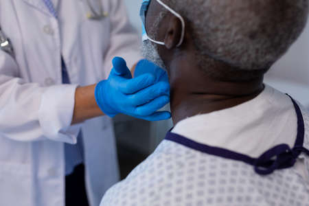 Caucasian female doctor palpating lymph nodes of african american male patient wearing mask. medicine, health and healthcare services during coronavirus covid 19 pandemic.