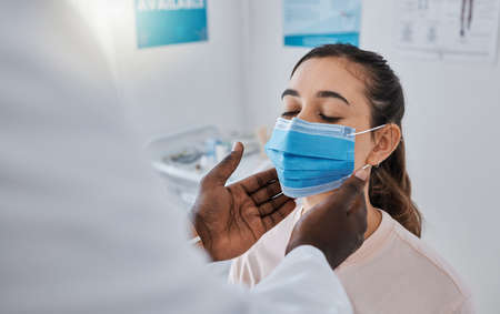 Female patient in thyroid exam from doctor, checking throat for covid virus in gp appointment or medical checkup in hospital. Woman with health insurance and face mask getting healthcare treatment